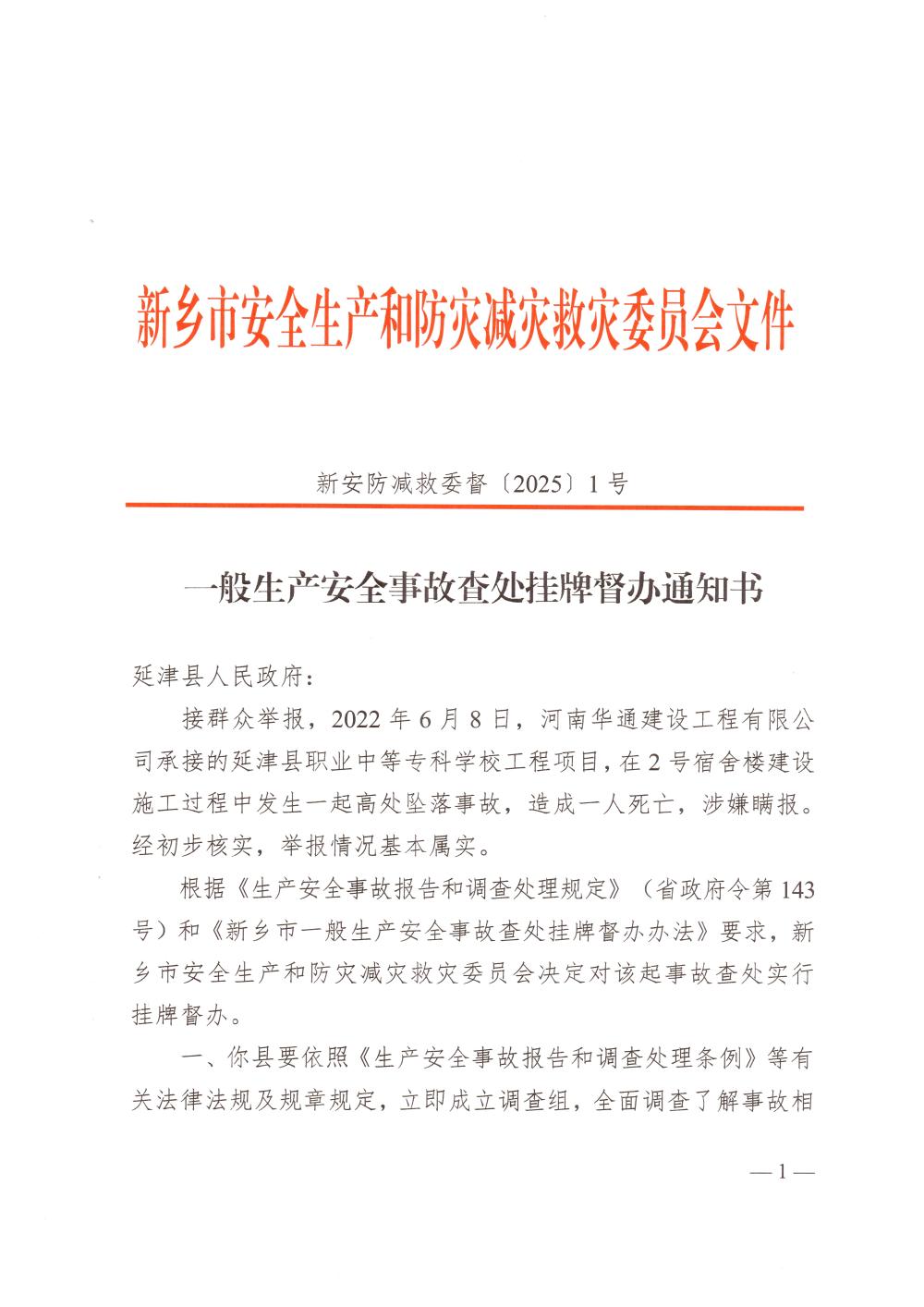 一般生产安全事故查处挂牌督办通知书 新安防减救委督〔2025〕1 号