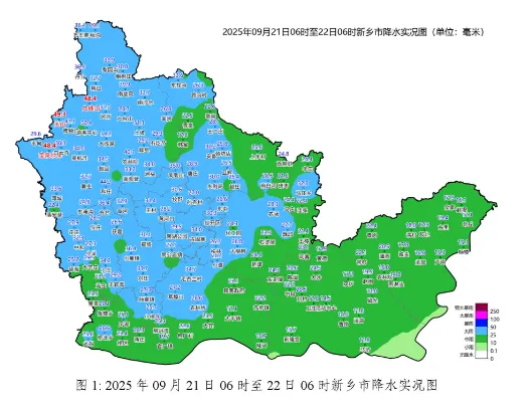 21日06时至22日06时,我市出现中到大雨。全市平均降水量23.9毫米,各县(市、区)平均降水量依次为:辉县30.4毫米、市区29.8毫米、新乡县29.2毫米、获嘉27.7毫米、卫辉 24.3毫米、延津24.0毫米、原阳23.2毫米、平原示范区22.4 毫米、长垣16.7毫米、封丘14.2毫米。全市242个降水测站,累计降水量大雨(25~50毫米)站点有121个(占比50.0%)。站点累计降水量前三位依次为:辉县八里镇关山49.3毫米、辉县薄壁镇宝泉水库48.4毫米、辉县黄水乡九峰山48.4毫米。最大小时雨强为新乡县小冀镇站6.3毫米(22日04~05时)。各国家站累计降水量(单位:毫米)依次为:新乡30.1、辉县29.2、原阳27.4、获嘉 26.6、卫辉26.5、延津24.4、长垣18.9、封丘14.7。