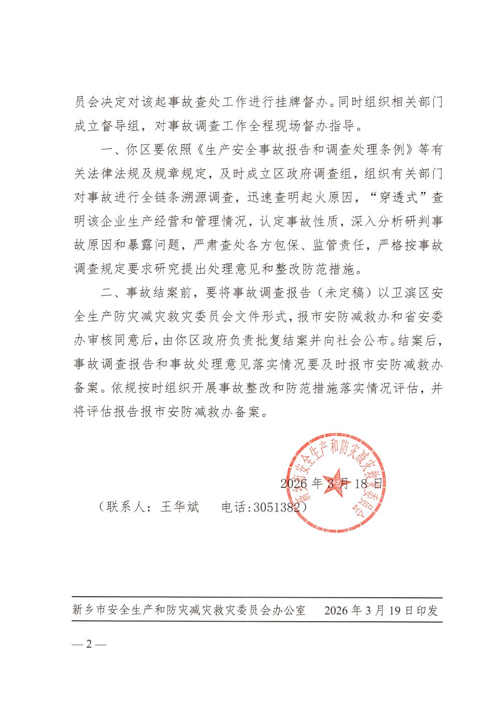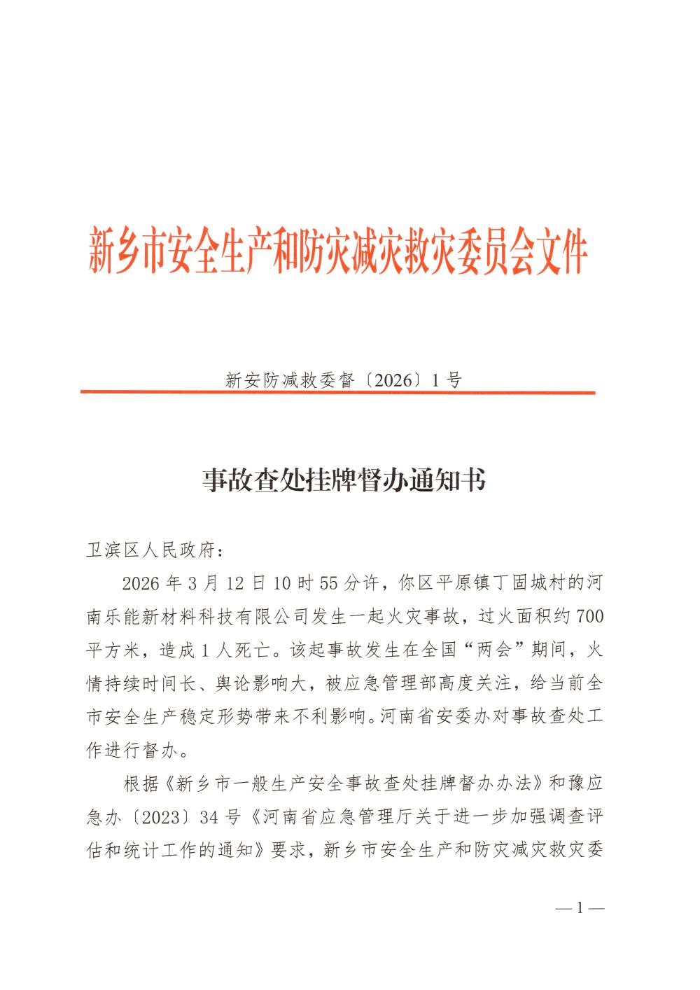 事故查处挂牌督办通知书 新安防减救委督〔2026〕1 号
