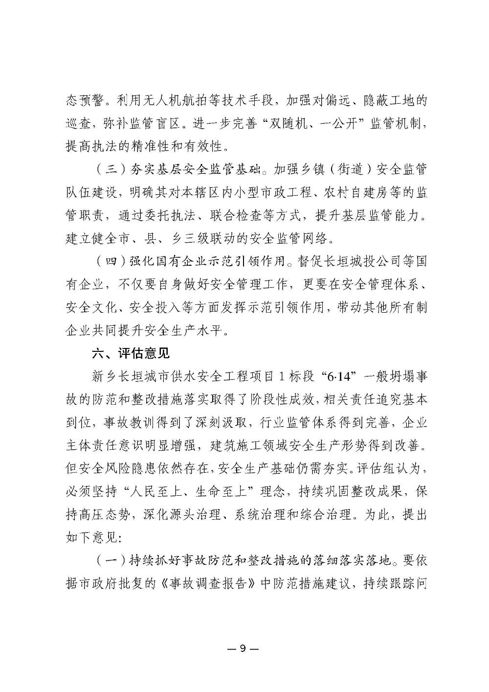 新乡长垣城市供水安全工程项目1标段“6·14”一般坍塌事故防范和整改措施落实情况评估报告