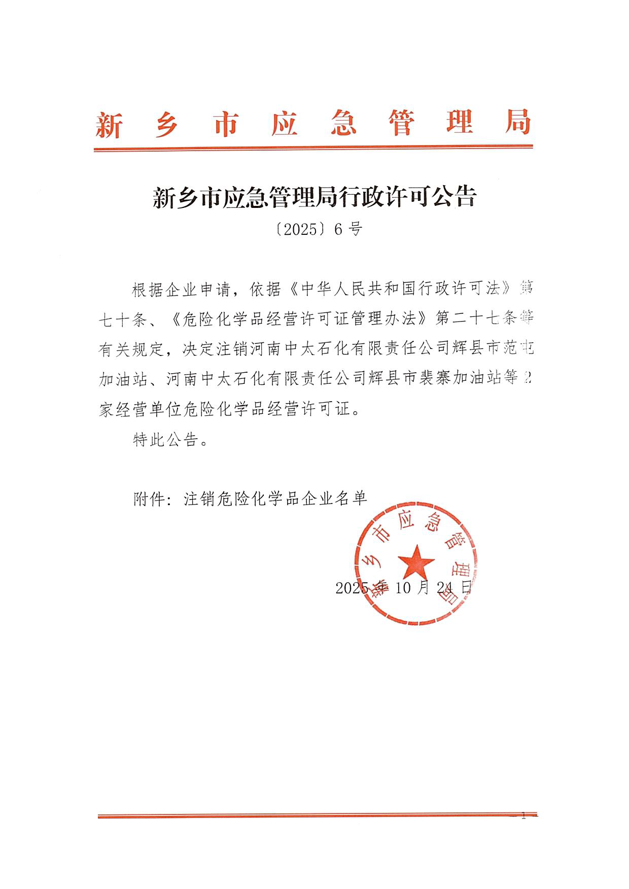 新乡市应急管理局行政许可公告(〔2025〕6 号)