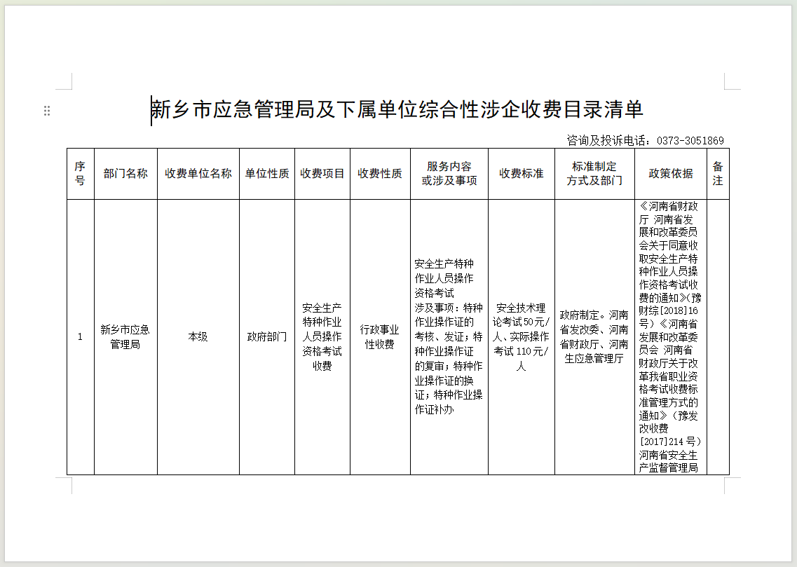 新乡市应急管理局及下属单位综合性涉企收费目录清单