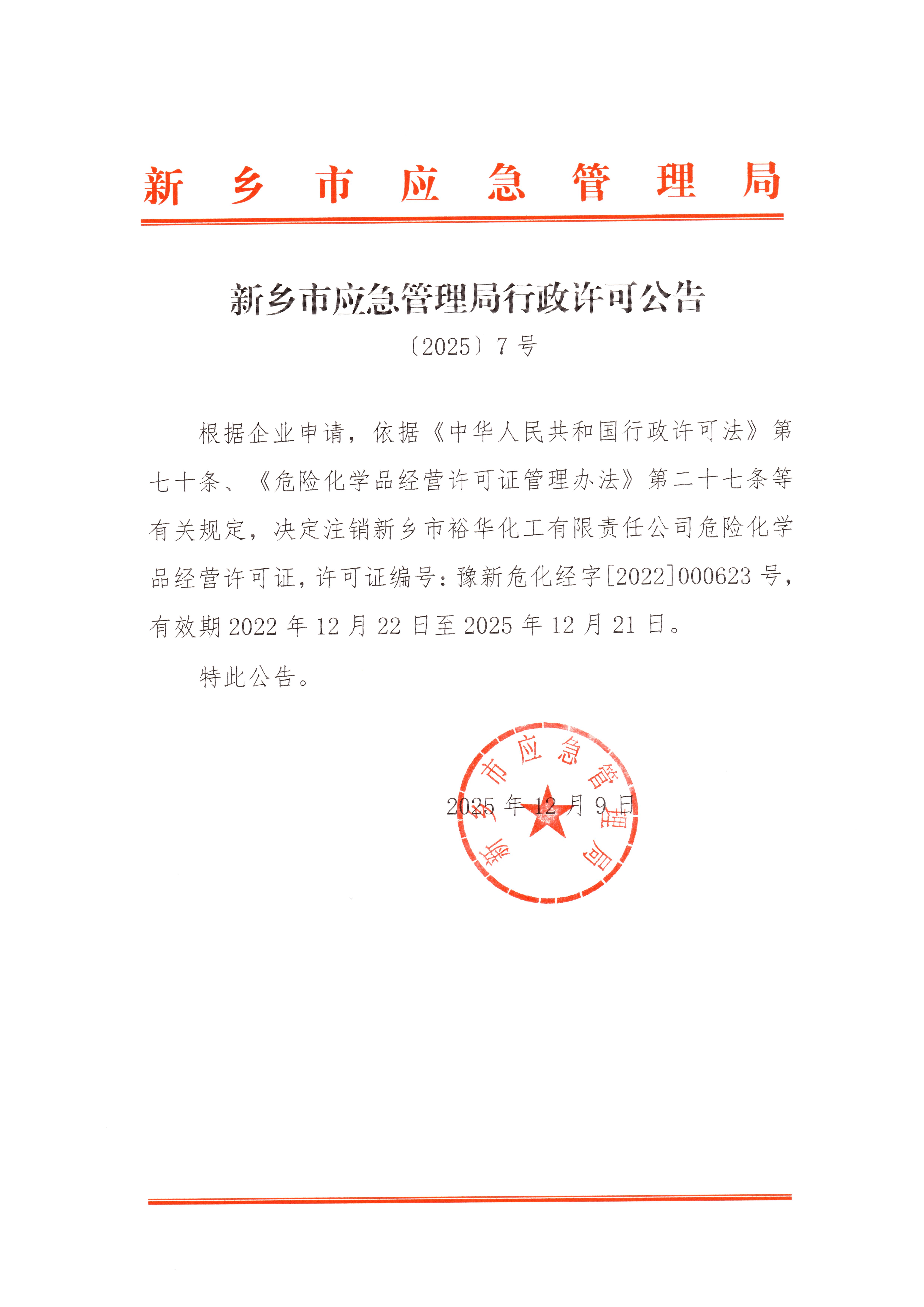 新乡市应急管理局行政许可公告(〔2025〕7 号)