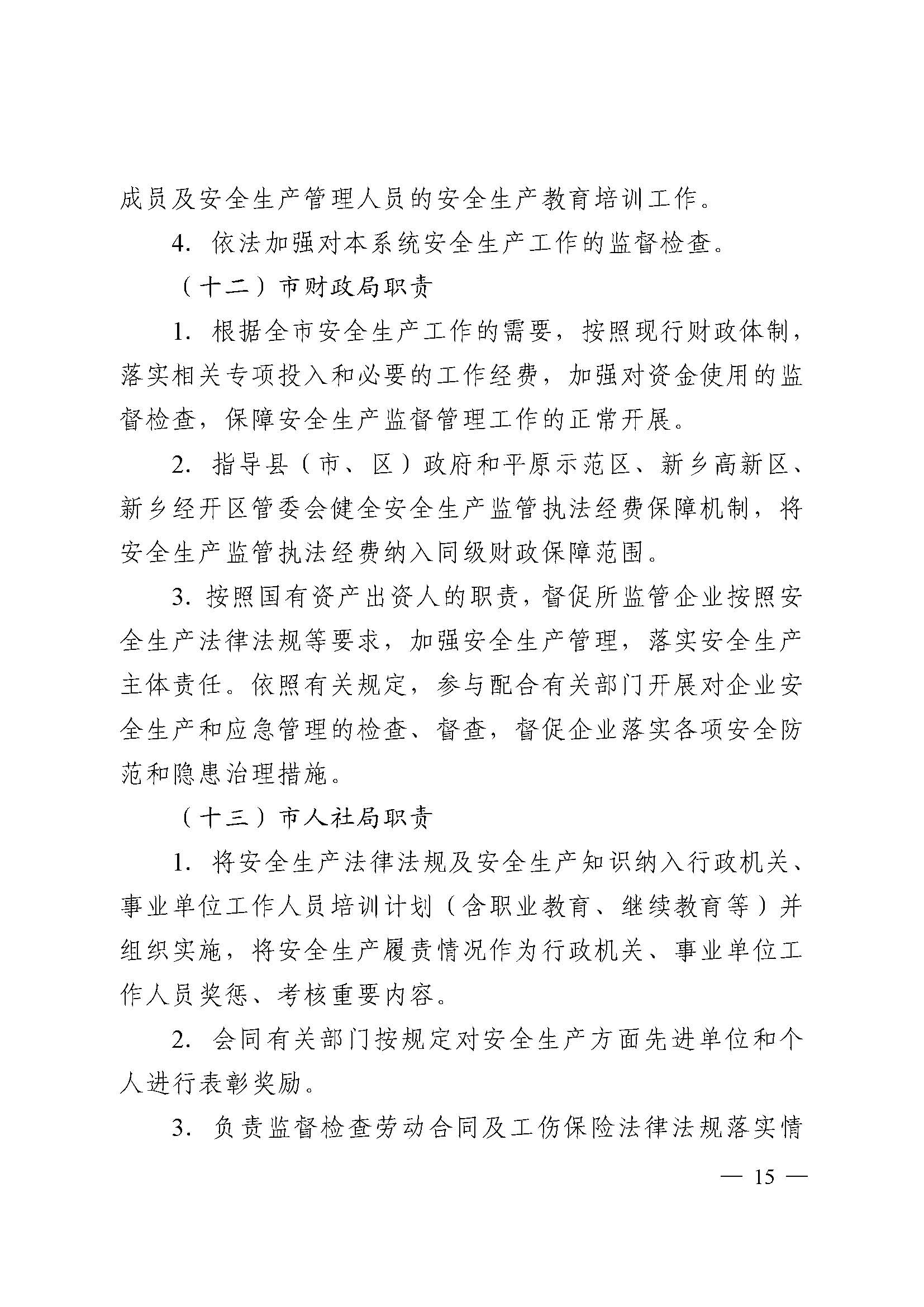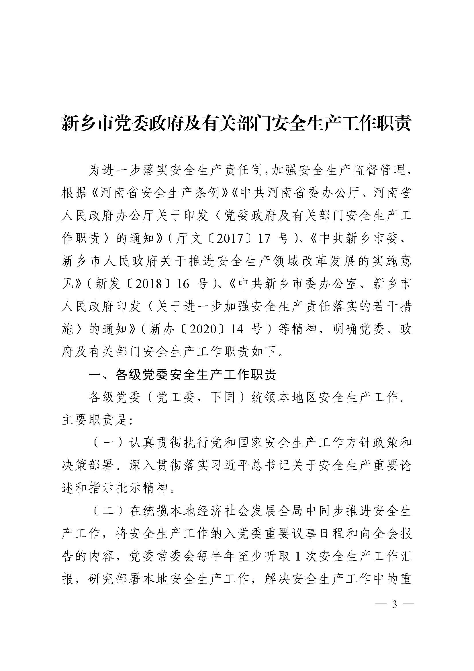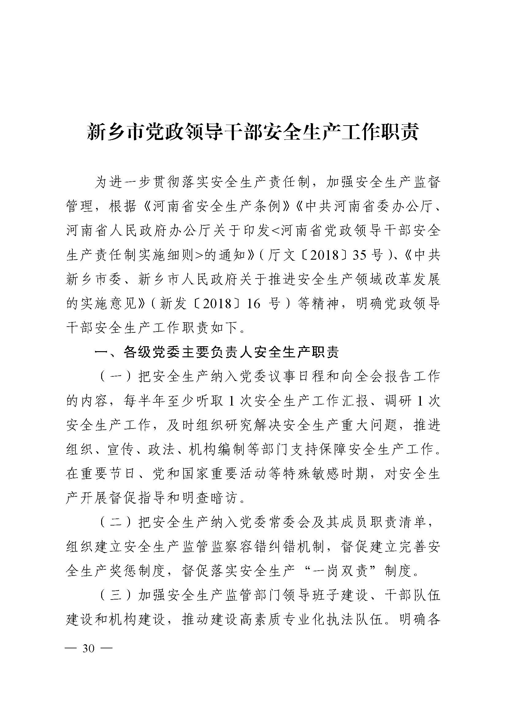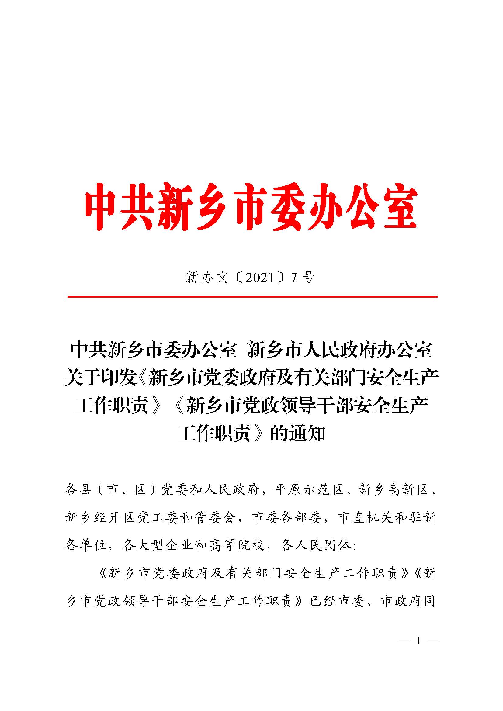 中共新乡市委办公室 新乡市人民政府办公室 关于印发《新乡市党委政府及有关部门安全生产工作职责》《新乡市党政领导干部安全生产工作职责》的通知